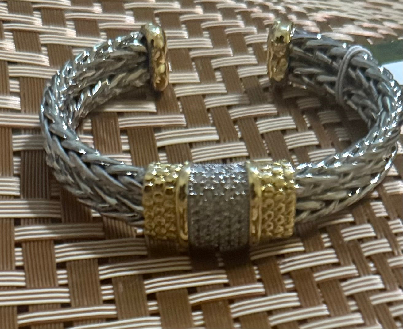 This bracelet is a silver dipped bangle with gold plated accents with CZ blinged bar.