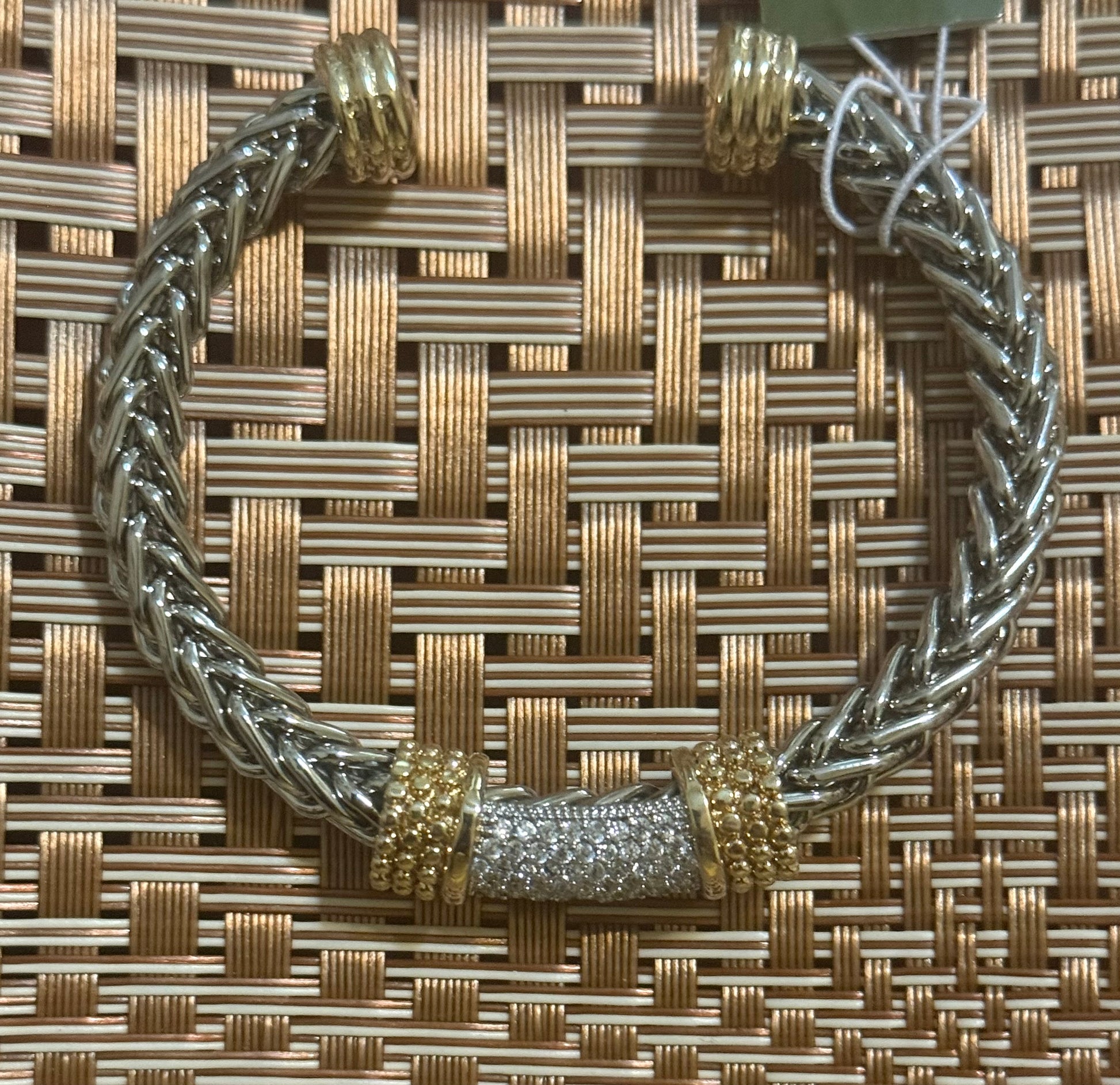 Silver dipped bangle with gold dipped accents with CZ bar charm.