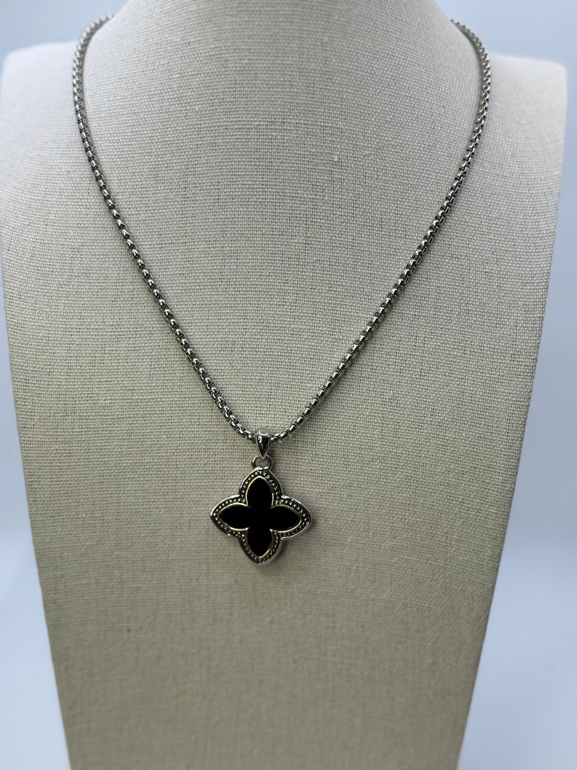 Black clover pendant with a touch of gold on silver plated chain