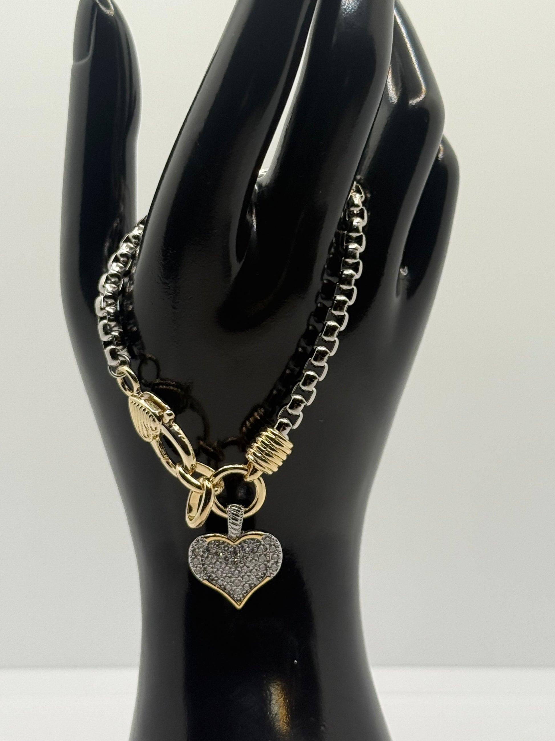This blinged heart charm is attached to a silver and gold plated bracelet. It also has a gold plated heart charm.