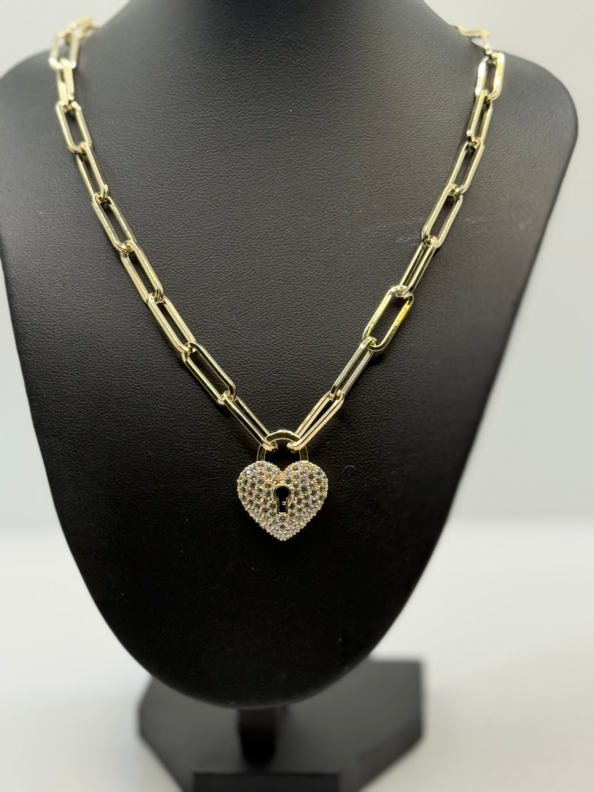 This blinged locked heart necklace is a must have. It’s on a paperclip necklace and will compliment a date night outfit.