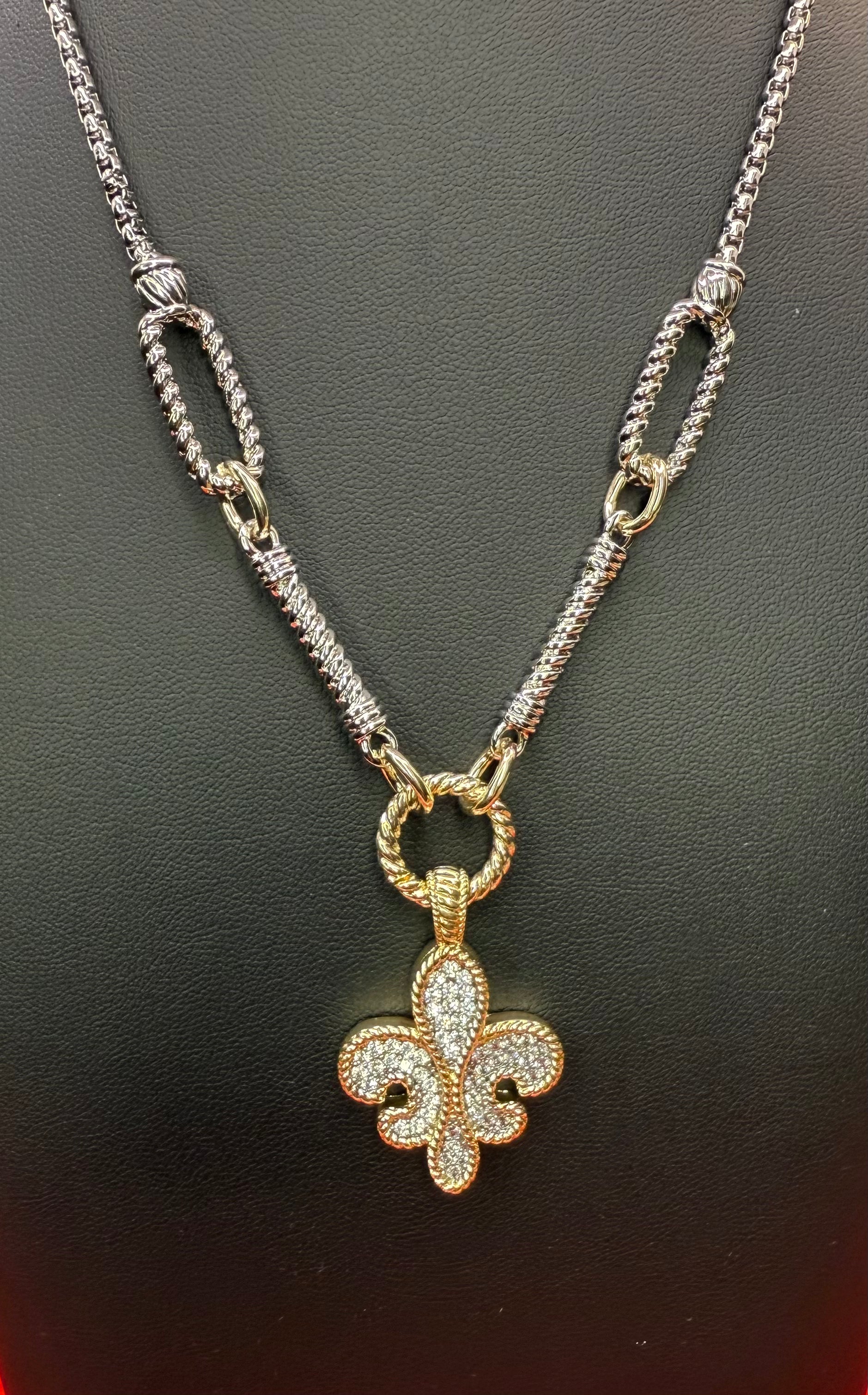 You'll admire this Fleur De Lis pendant on gold and silver-plated necklace. Matching stud earrings in stock as well, you don't want to miss these beauties!!!