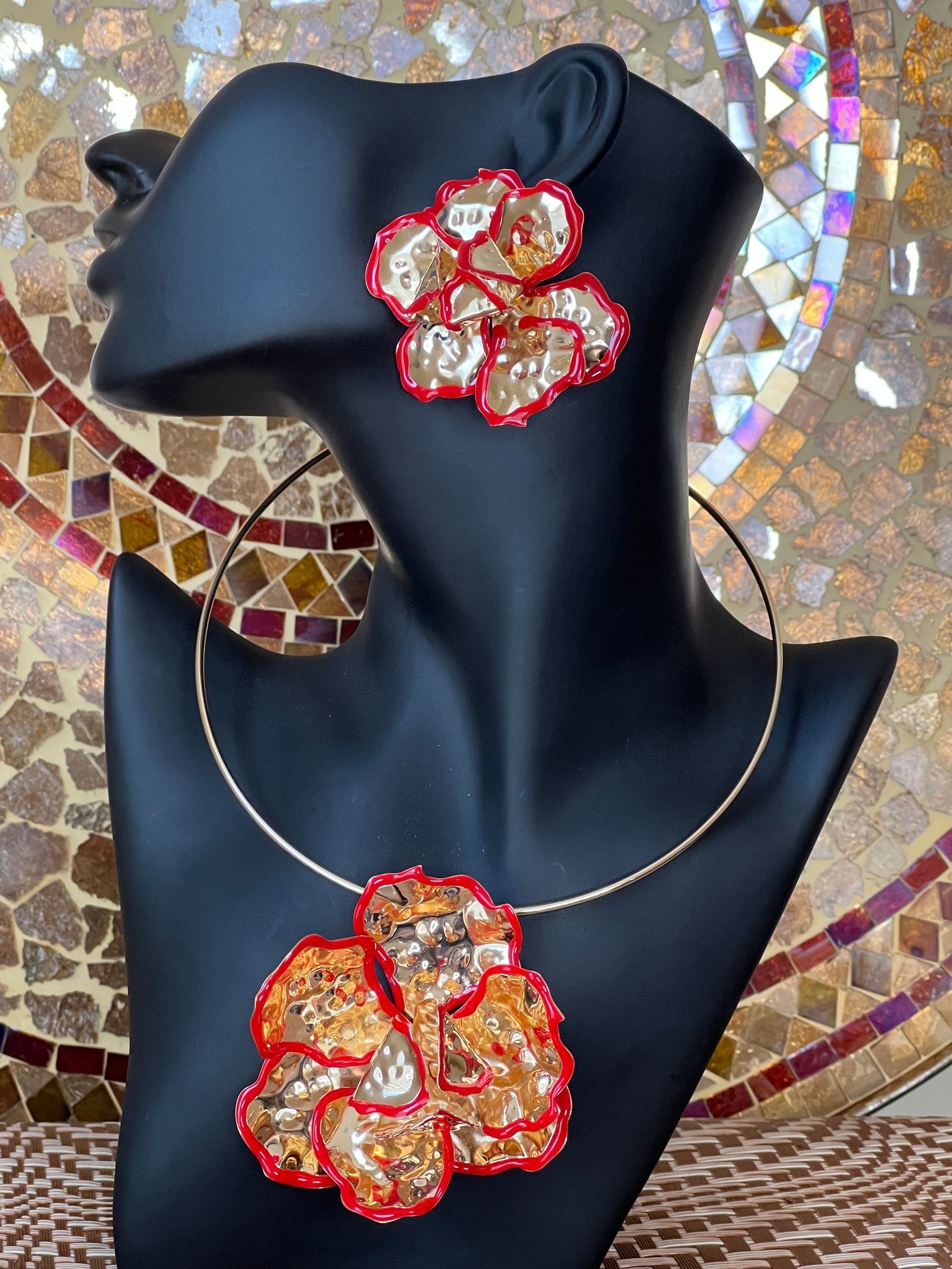 You can choose your color of choker and earring set, guaranteed to accessorize your outfit. Gold choker and earring in multiple colors: red, black, white, burgundy