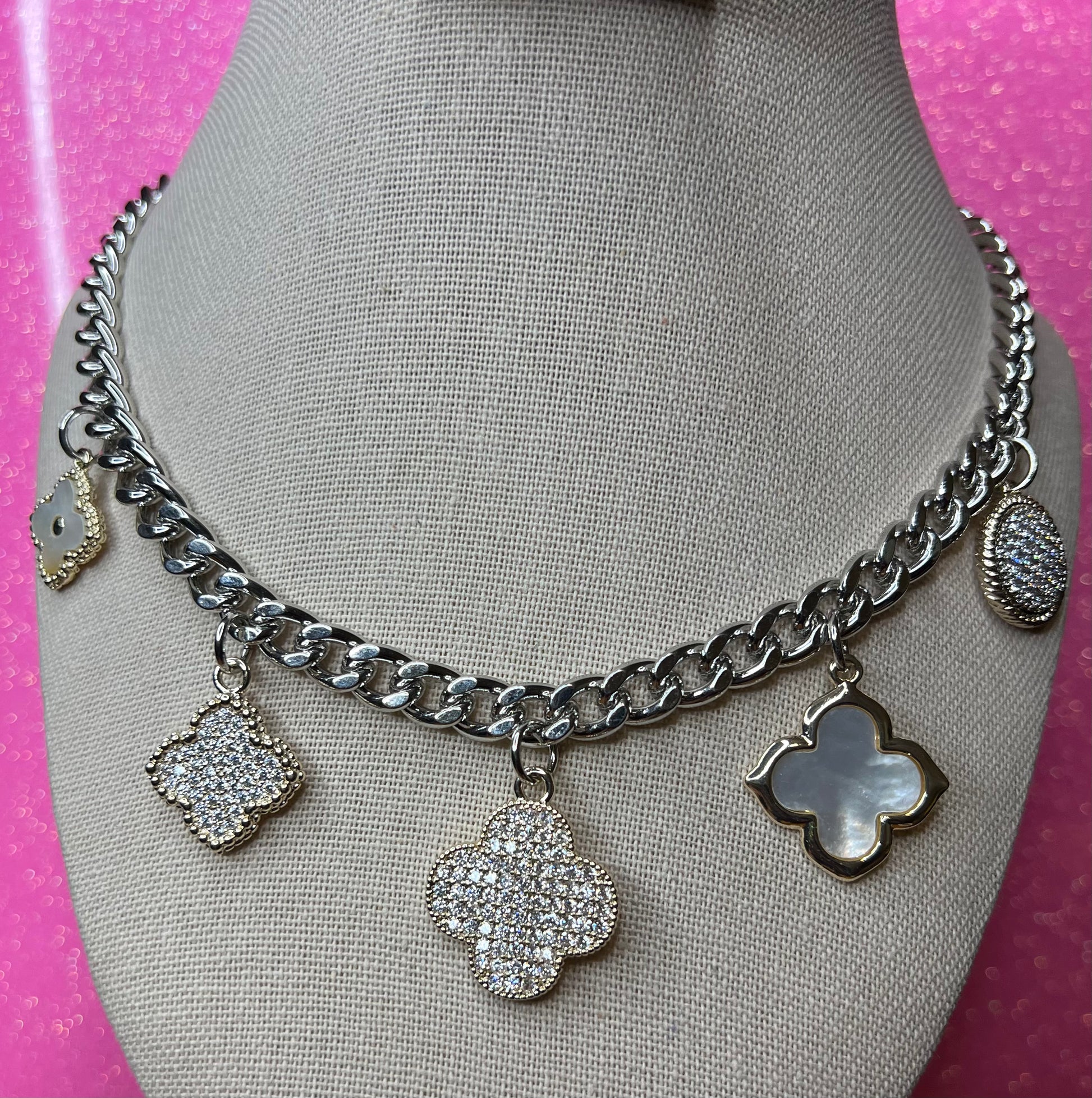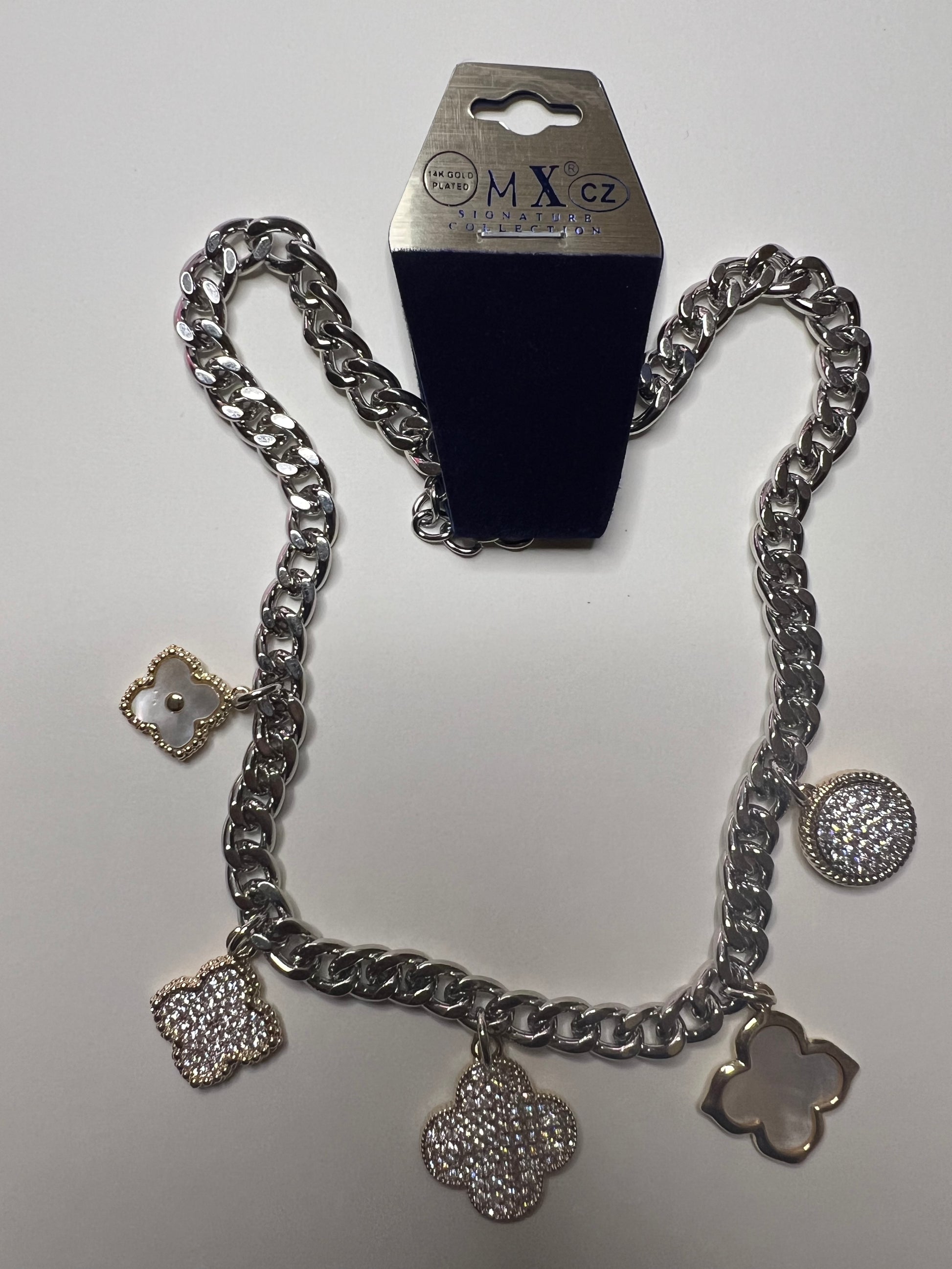 Classy silver necklace with gold embellished clover charms, some charms with bling for those of you that like that extra sparkle!