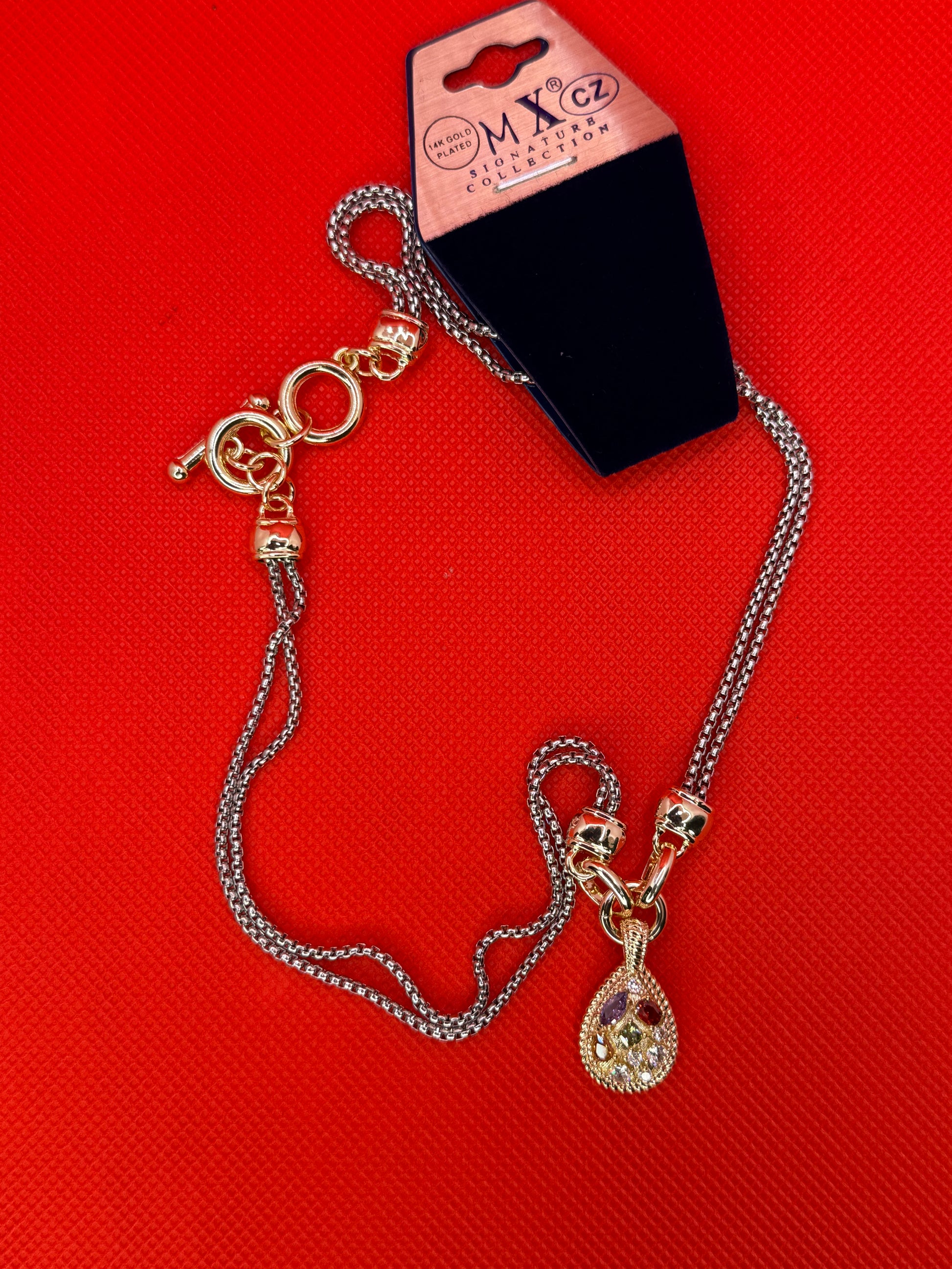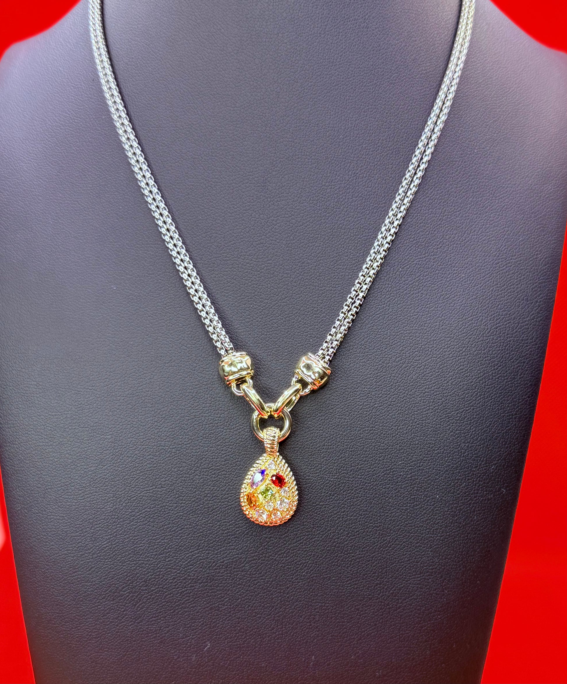 This beauty has gold- and silver-plated chain with teardrop multi stone pendant, gold toggle closure.