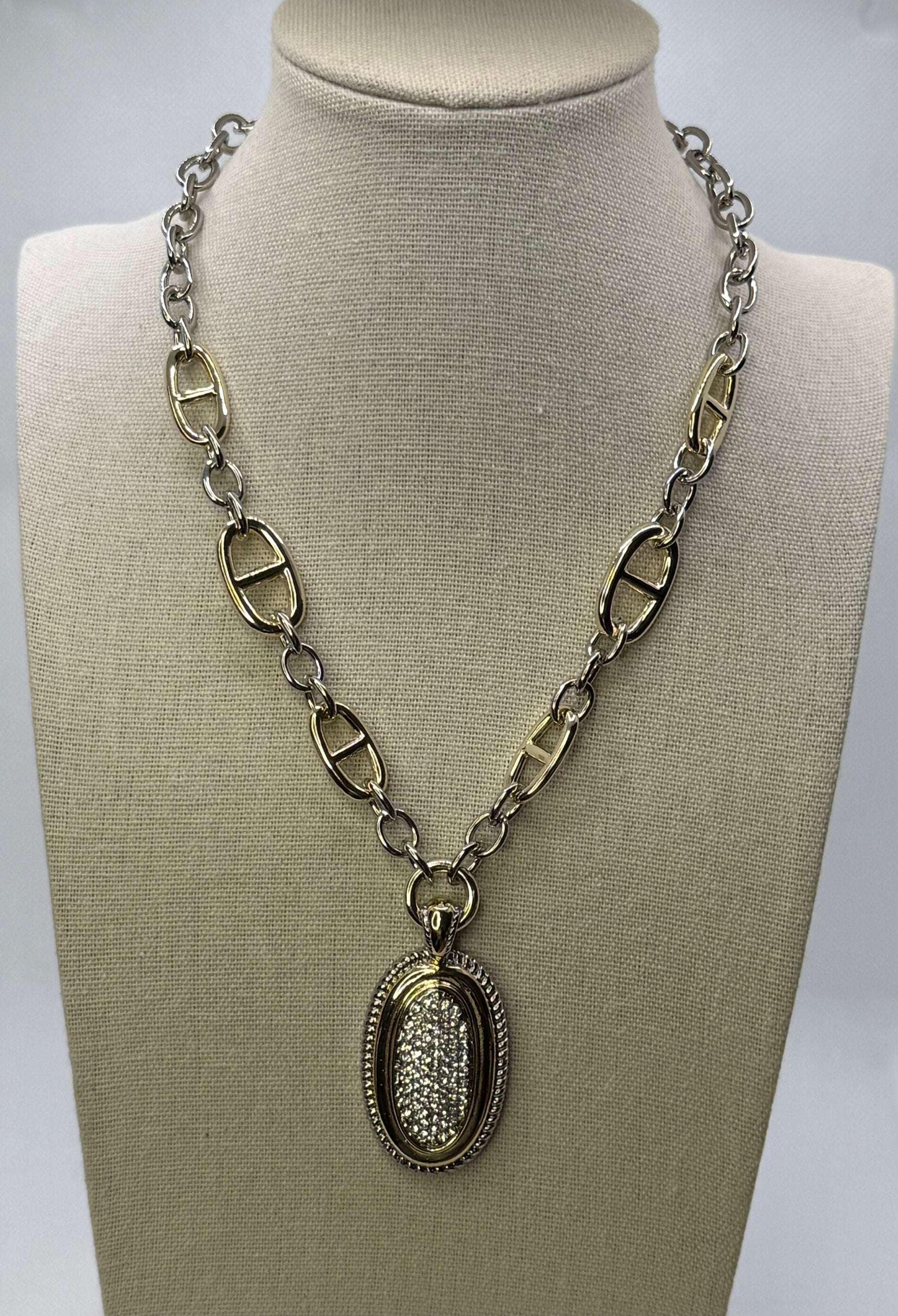Oval pendant with sparkle on silver and gold plated necklace