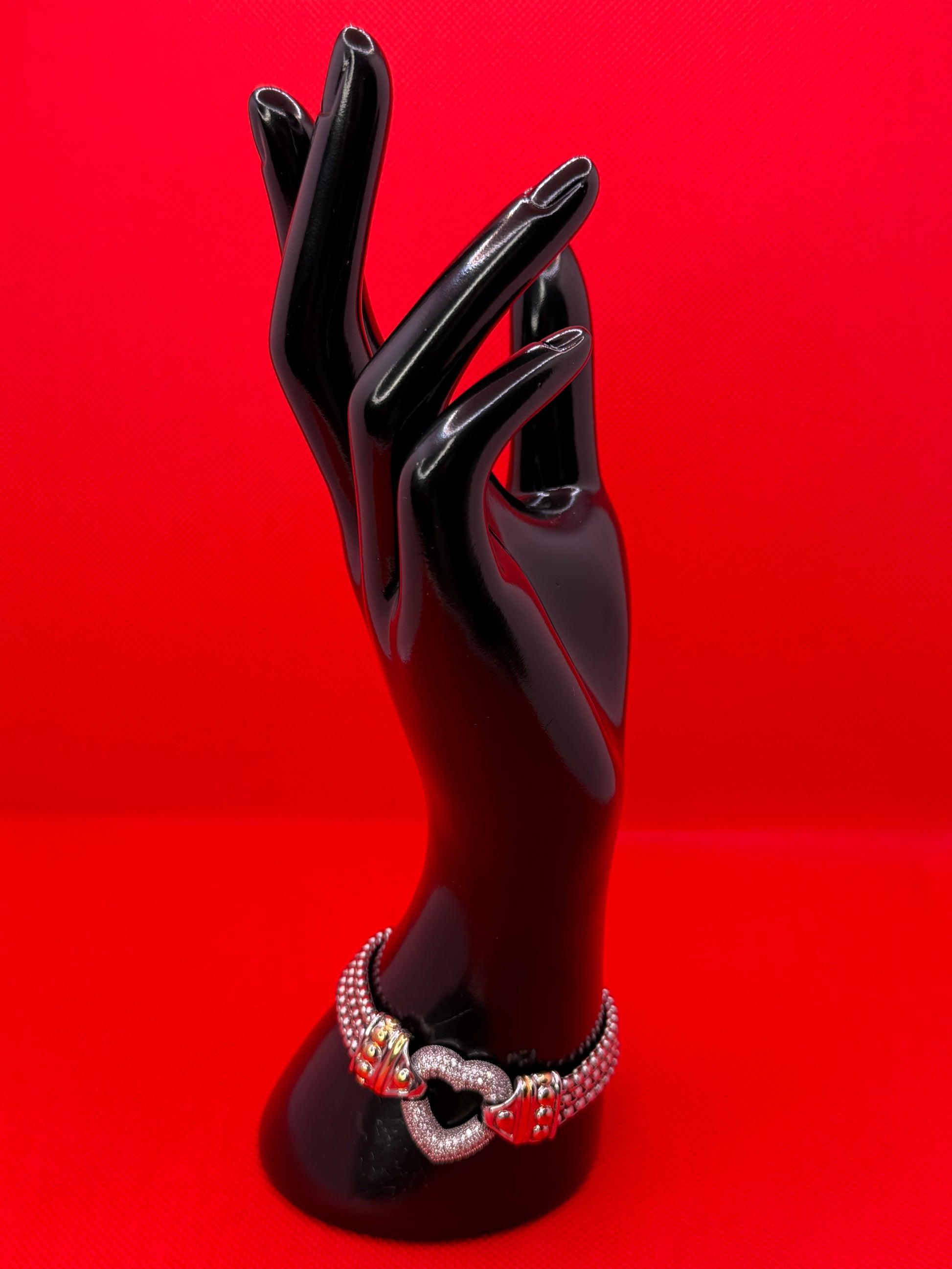 This blingy heart bracelet has 3 silver chains connected with magnetic closure. MX signature collection. Guaranteed to get many wears out of this beautiful bracelet.