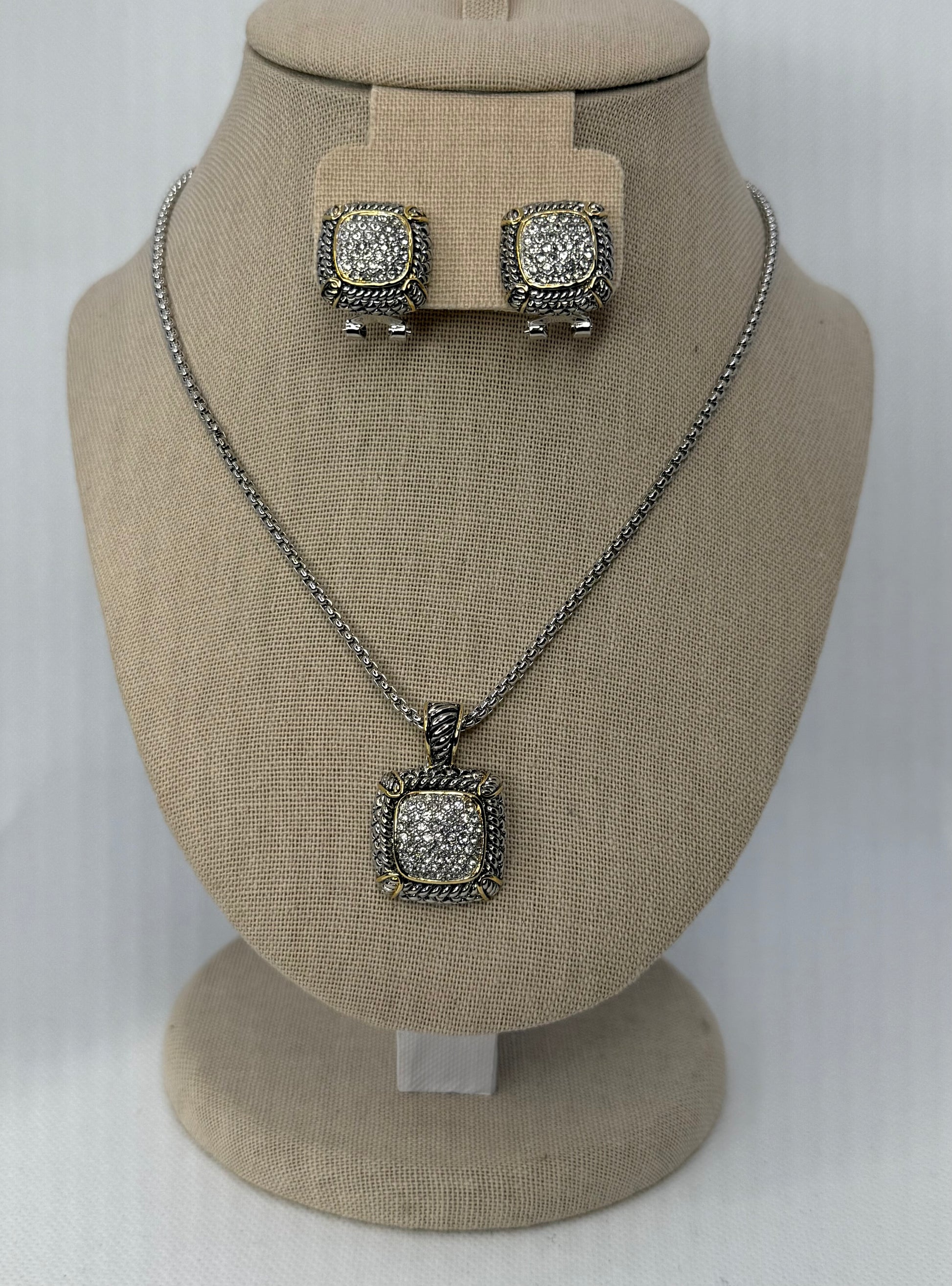 This beautiful set is rhodium plated with a touch of gold around the clear stones; earrings can be worn as post back or clip on.