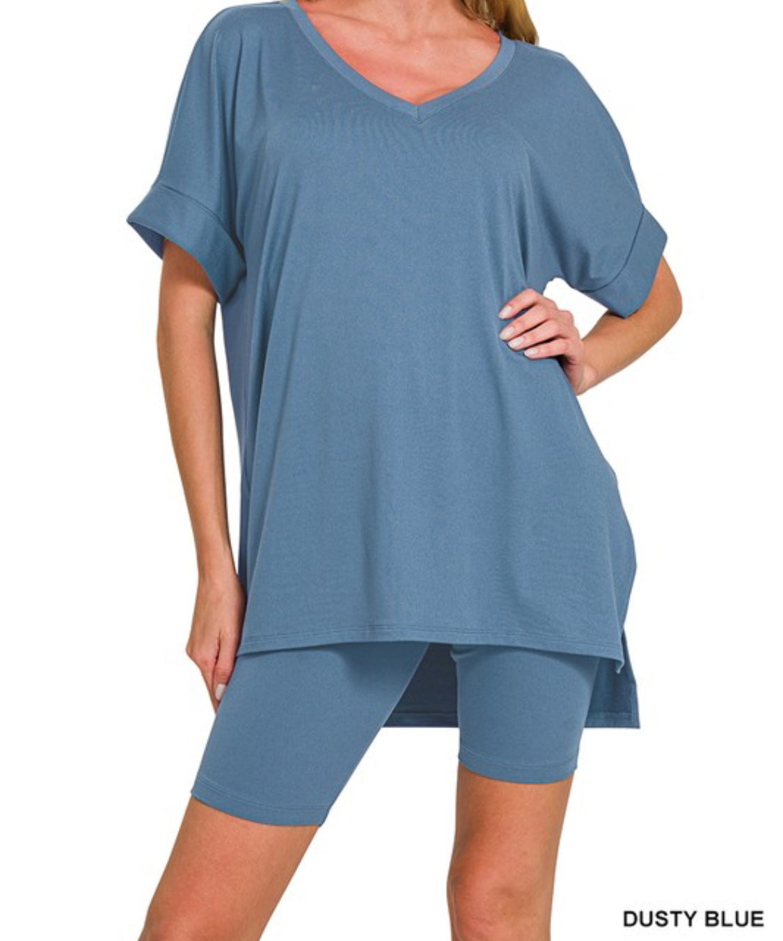 You will absolutely love how comfortable and soft these set are. You will want to wear them every day. Shirt is V-neck with side slits and hi-low hem to cover, if you choose to, biker shorts.
